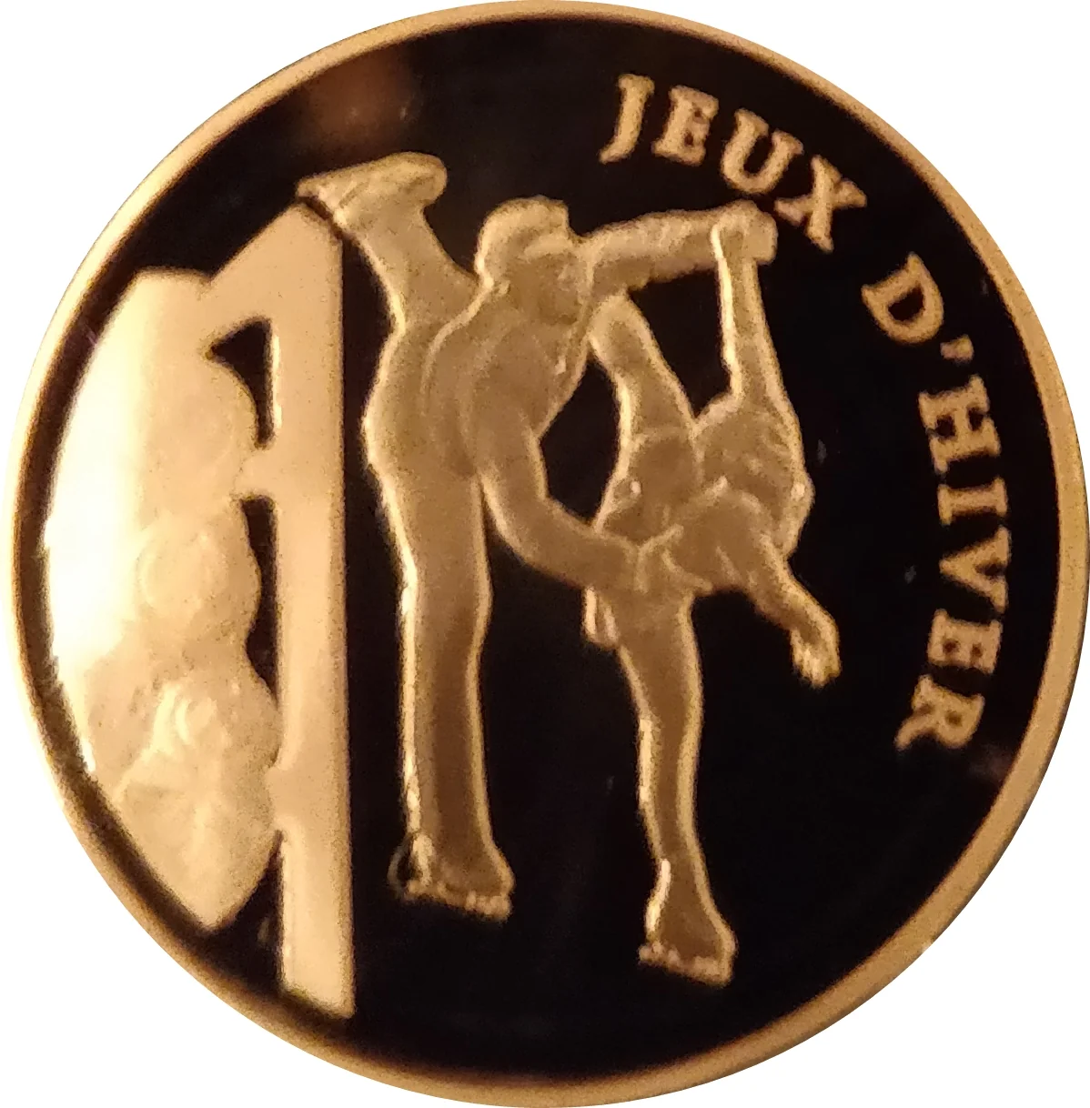 A coin depicting a pair of competing figure skaters in an arabesque. A stylized audience, resembling three Russian dolls, is on the left, with "WINTER GAMES" inscribed on a right scroll. It commemorates the 2014 Sochi Olympics.