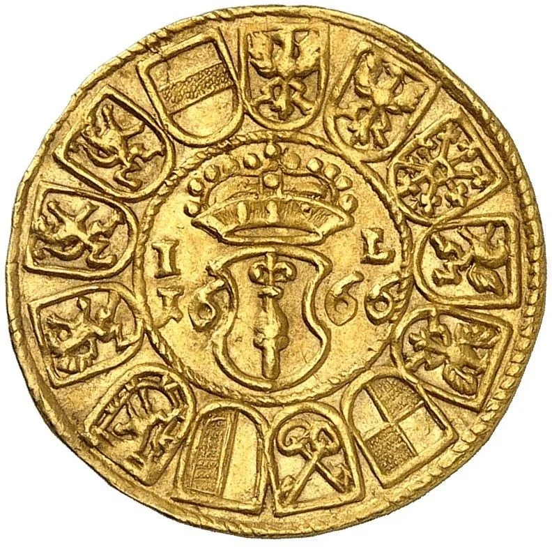 Scepter, shield, and date encircled by 13 heraldic shields.