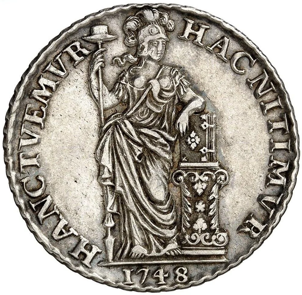 Female figure leaning on a bible on a column, holding a spear and cap. Date in exergue.