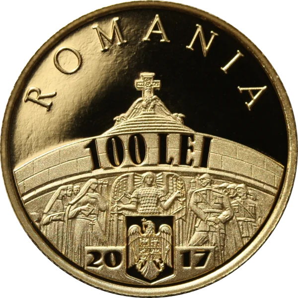 Mausoleum of Mărășești detail with arched "ROMANIA" inscription, 100 LEI face value, Romanian coat of arms, and 2017 issue year.