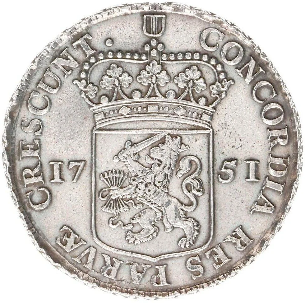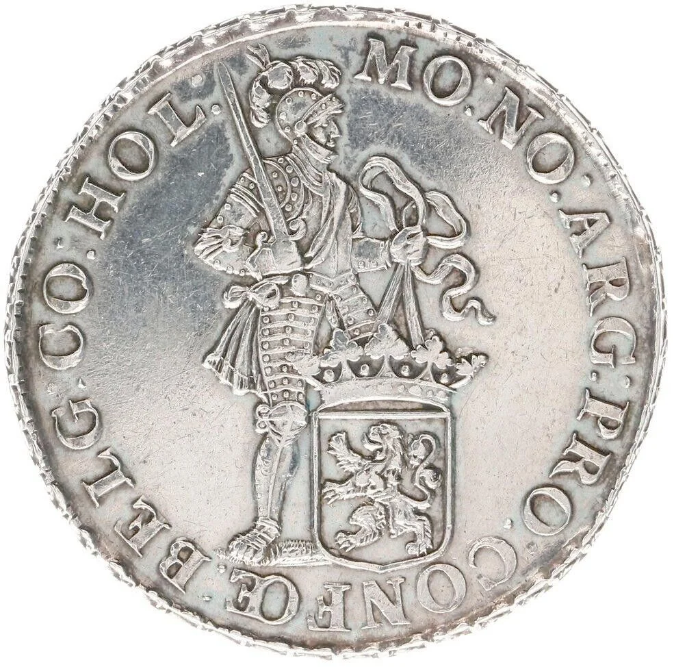 Armored knight facing right, helmet with plume, sword on shoulder, left hand holding ribbon with crowned arms of Holland.