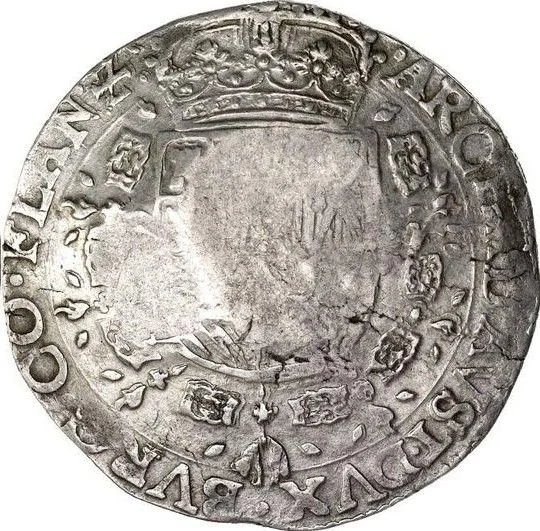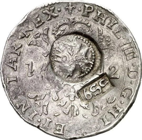 Jefimok Rouble counterstamped on a Spanish Netherlands Patagon (Dav# 4464). Host coin: 1622-1653. Counterstamp: date and spearman on horseback.