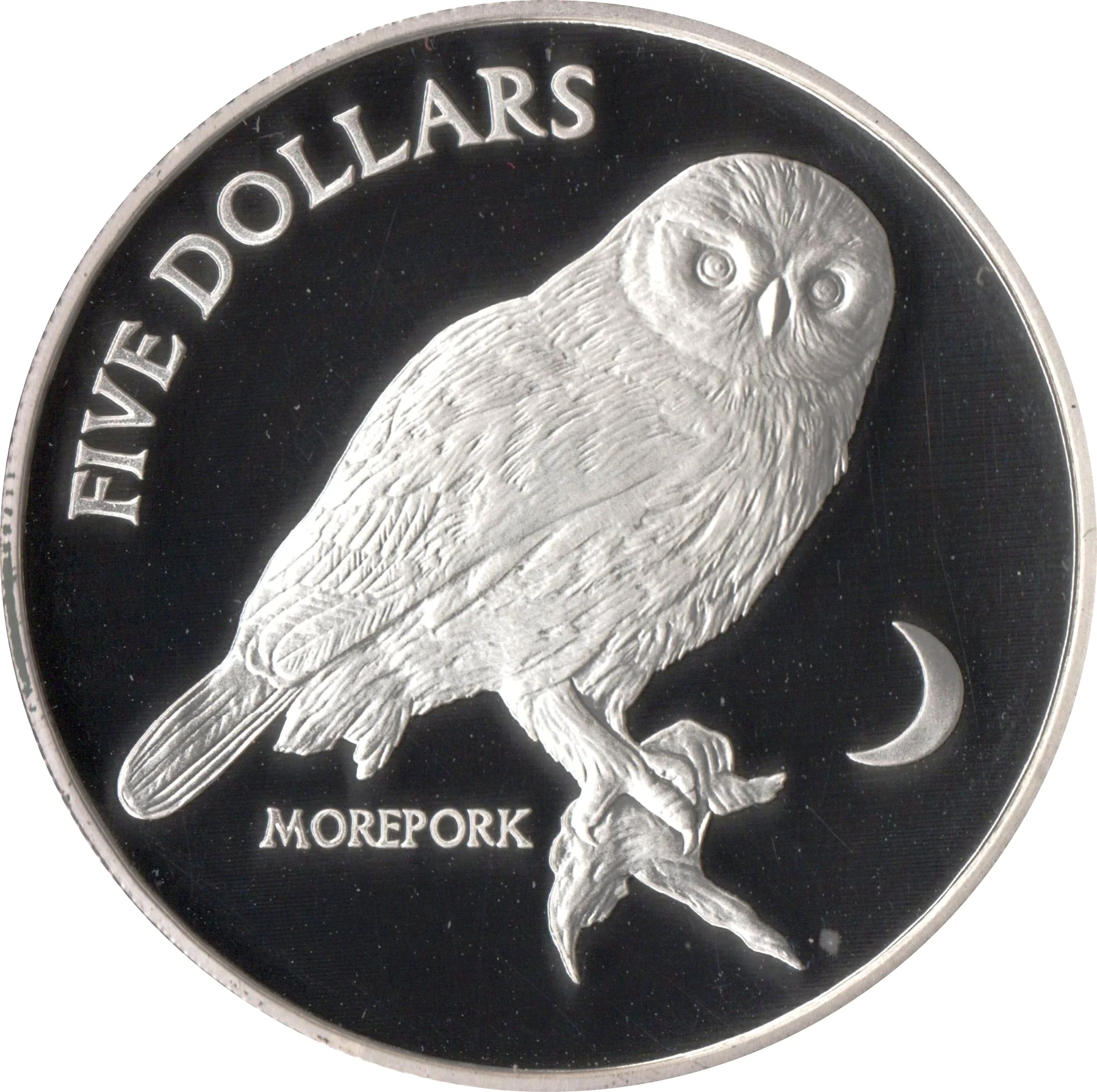 Morepork on branch with crescent moon. Legend above and below.