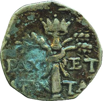 Scepter divides inscription within laurel wreath.
