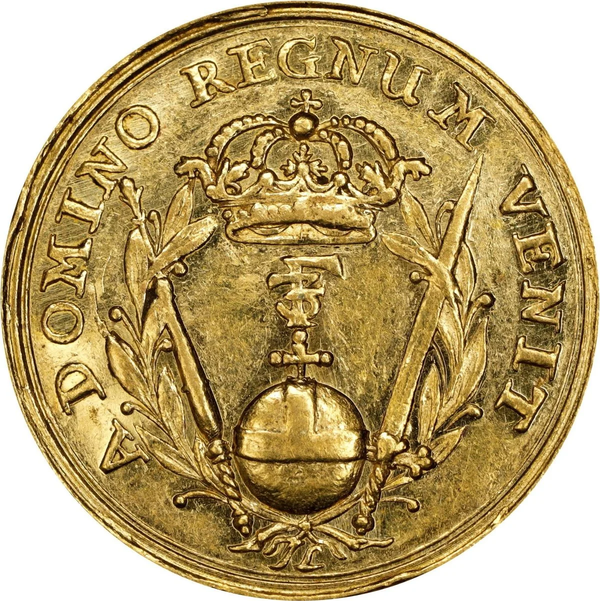 Crowned monogram over orb, between sword and scepter in wreath. Inscription surrounds. Solid rim ring.