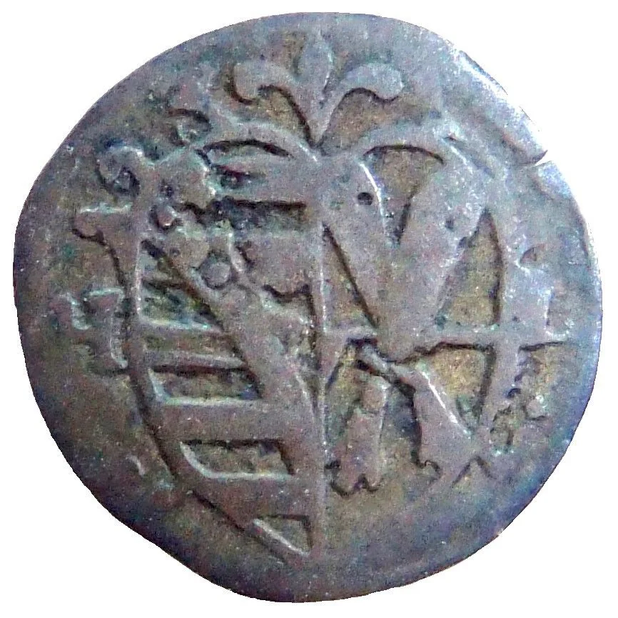 Coat of arms splits mint master's initials, year above.