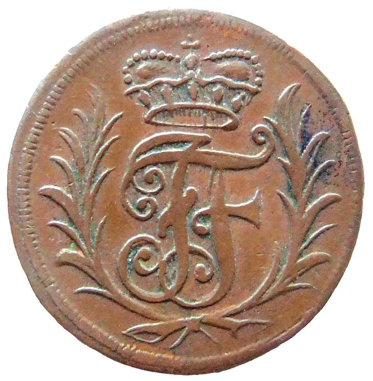 Crowned monogram in branches.