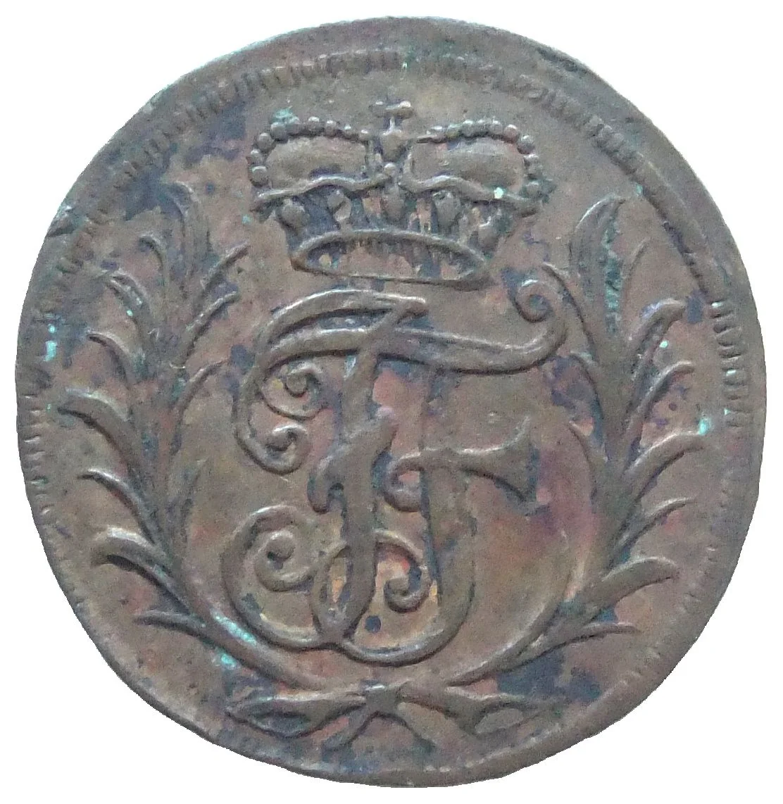 Crowned monogram in branches.
