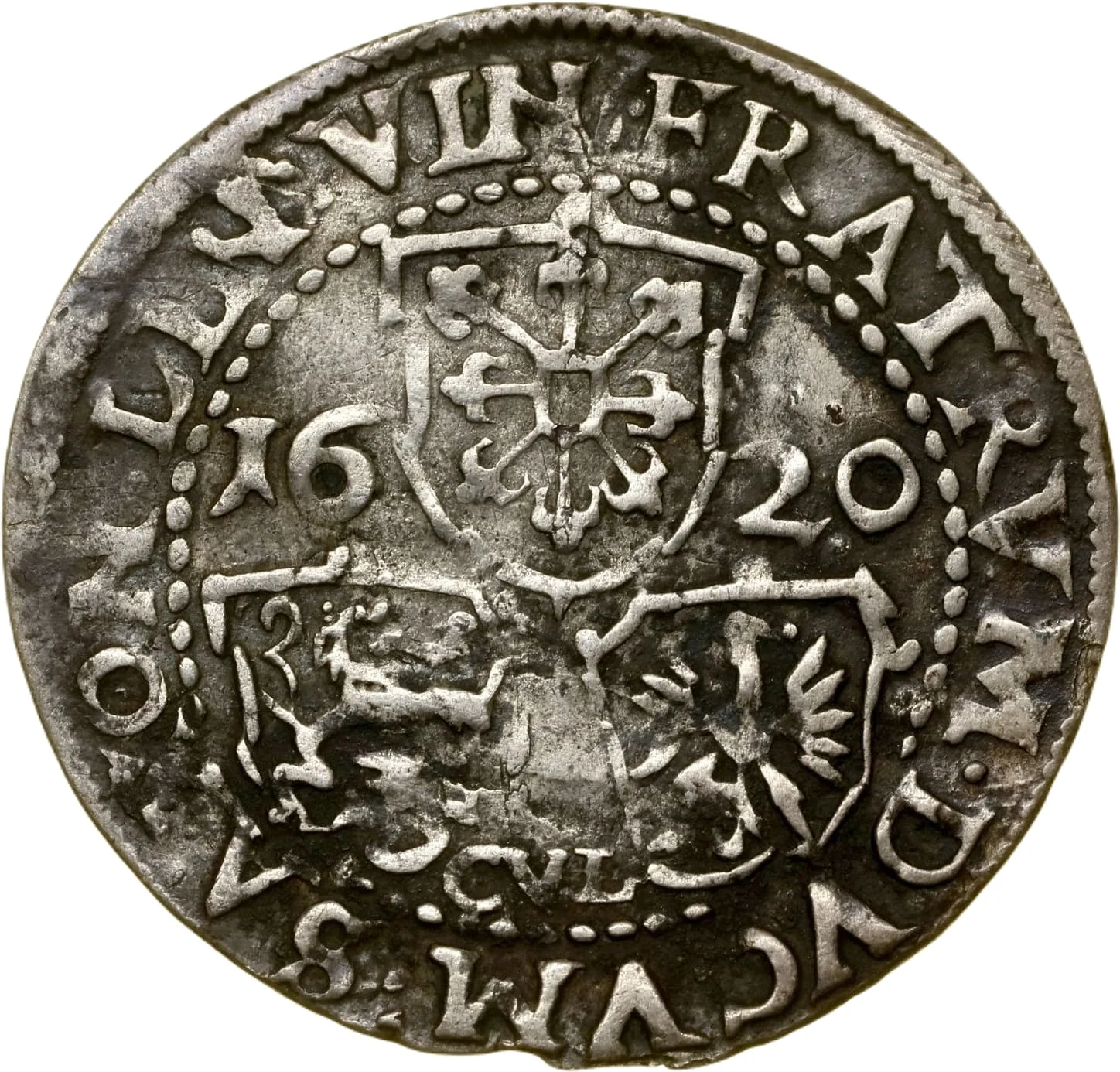 Three small ornate shields, one over two; date above, mintmaster's initials below.