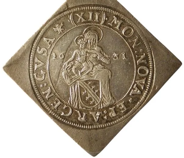 Madonna and child flank the date, above Alsace's arms.