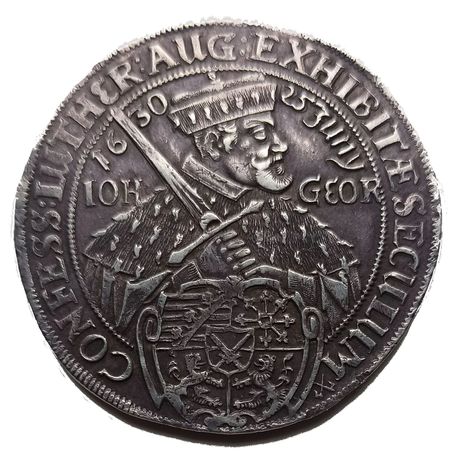Bust of Johann Georg wearing electoral hat, holding electoral sword. Inscription encircles, coat of arms beneath.