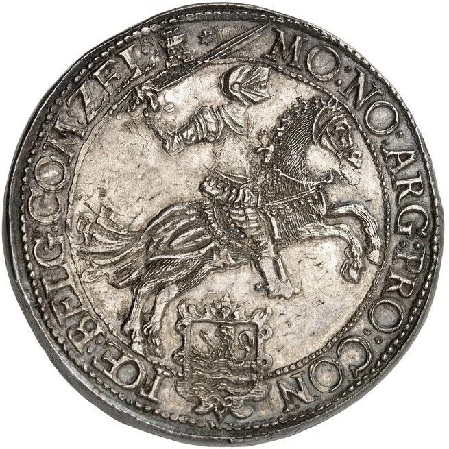 Armored knight on prancing horse, brandishing sword, above Zeeland's arms.