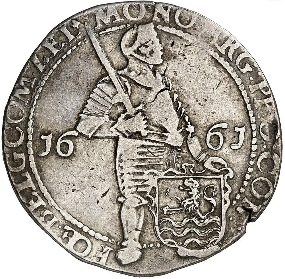 Armored knight standing, sword on shoulder, coat of arms at feet.