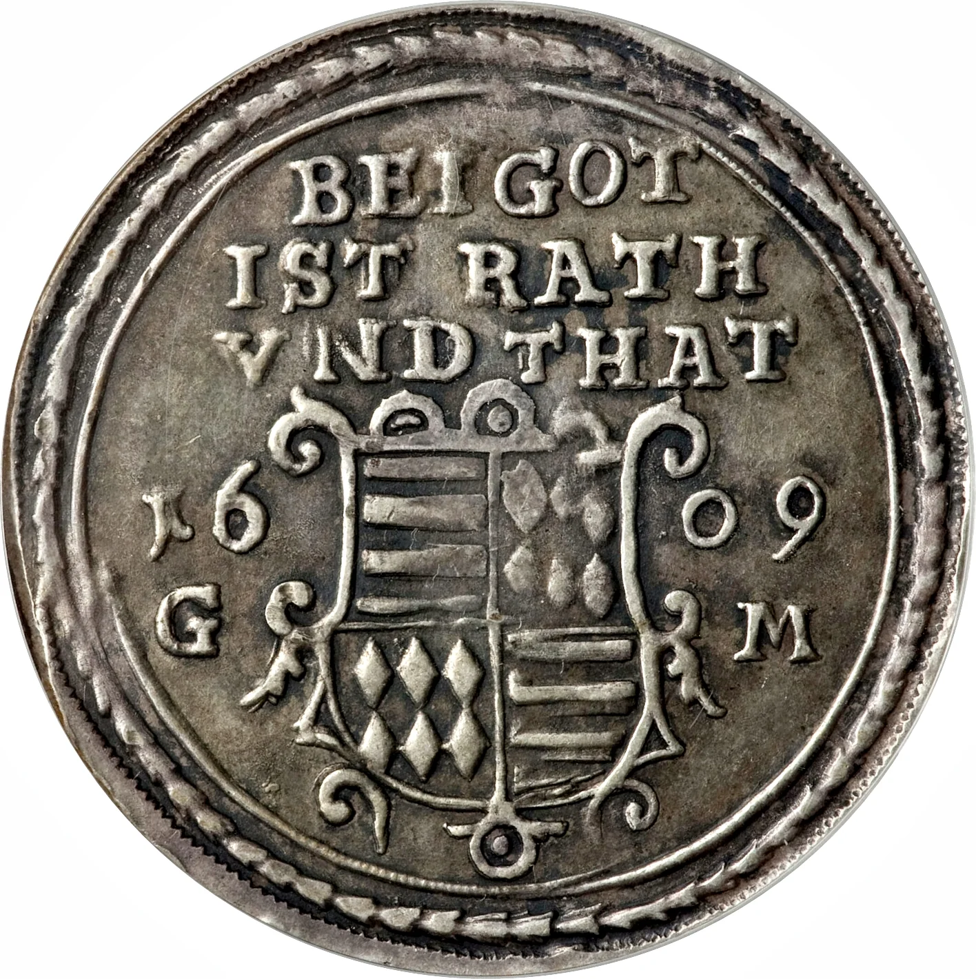 Shield, date, initials; inscription above.