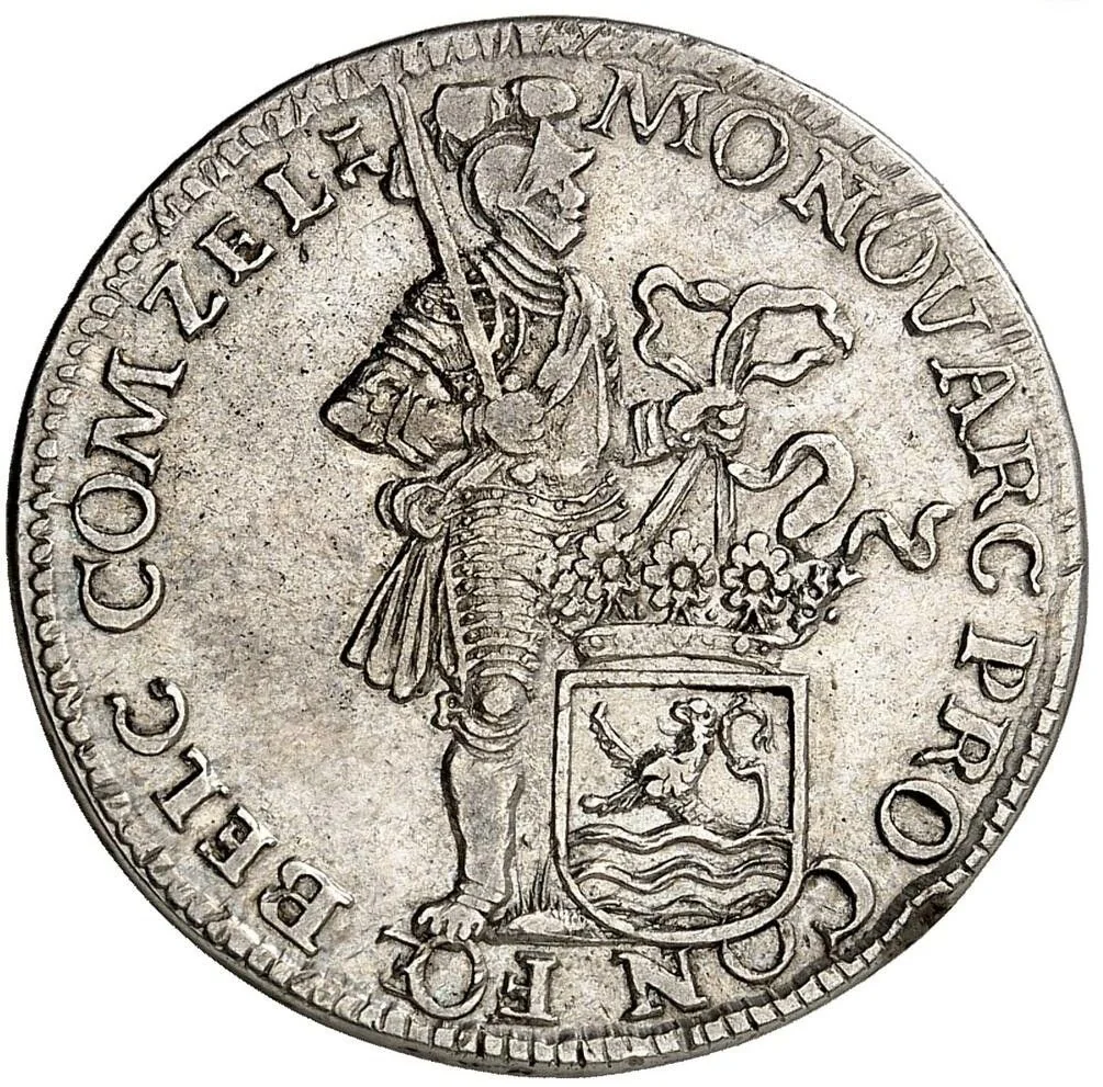 Armored knight standing with sword on shoulder, crowned coat of arms at feet.