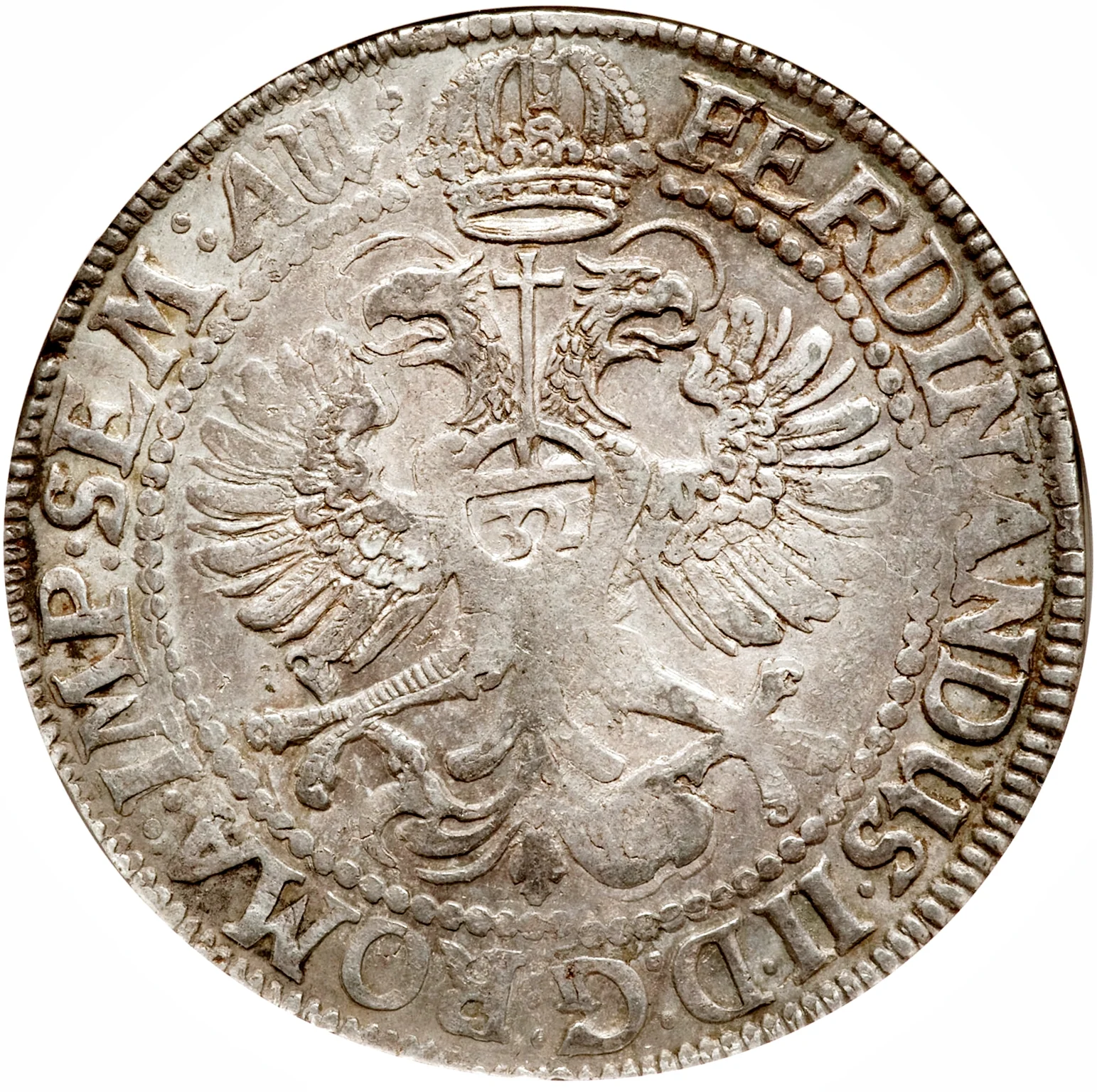 Crowned double-headed eagle with surrounding legend.