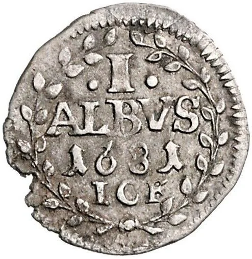 Shield of Sayn arms with mintmaster’s symbols in palm wreath.