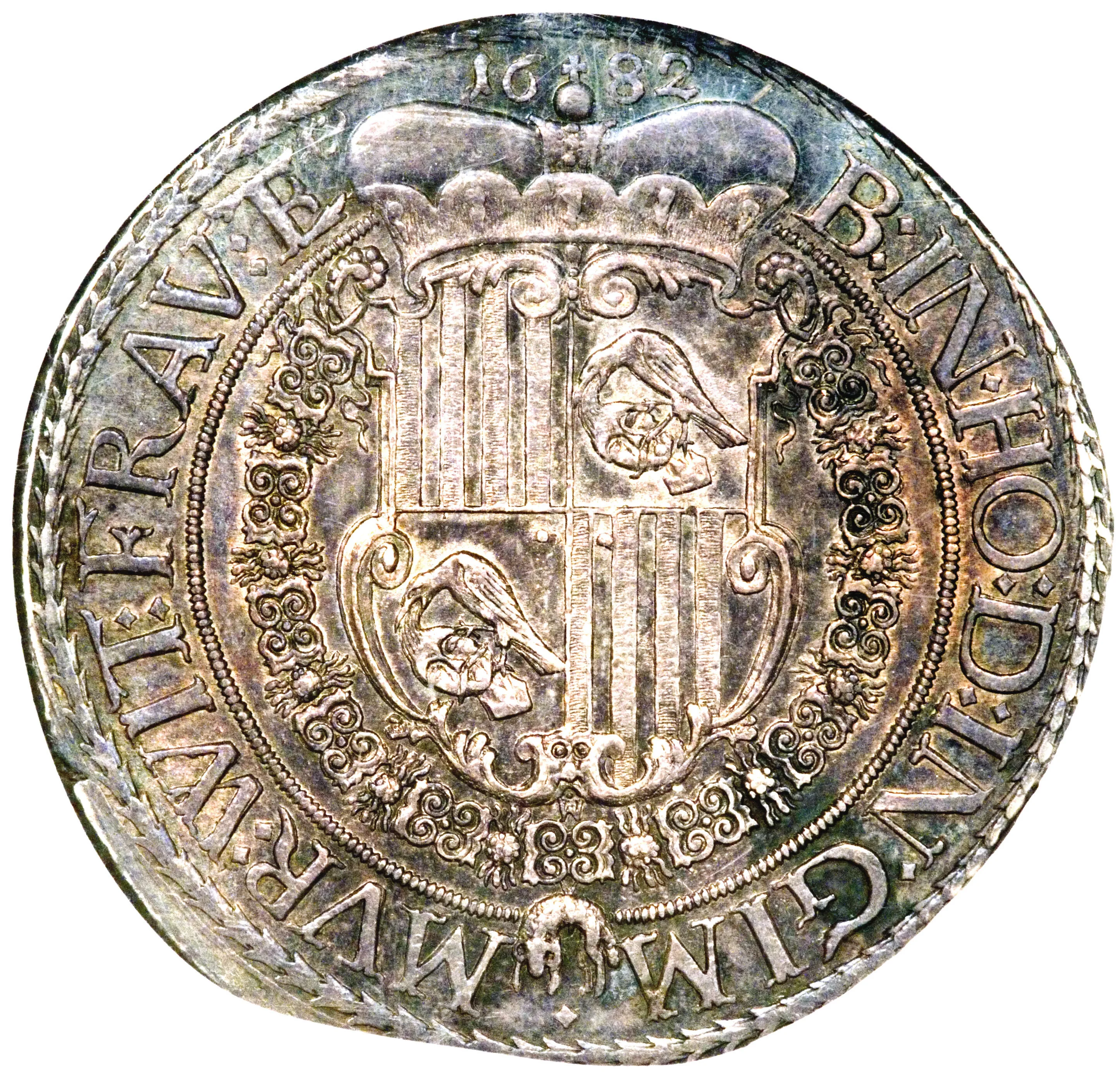 Crowned coat of arms with surrounding legend.
