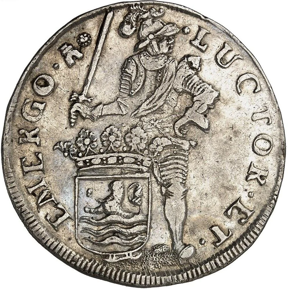 Zealand knight in armor, facing right with sword, before the Zeeland coat of arms.