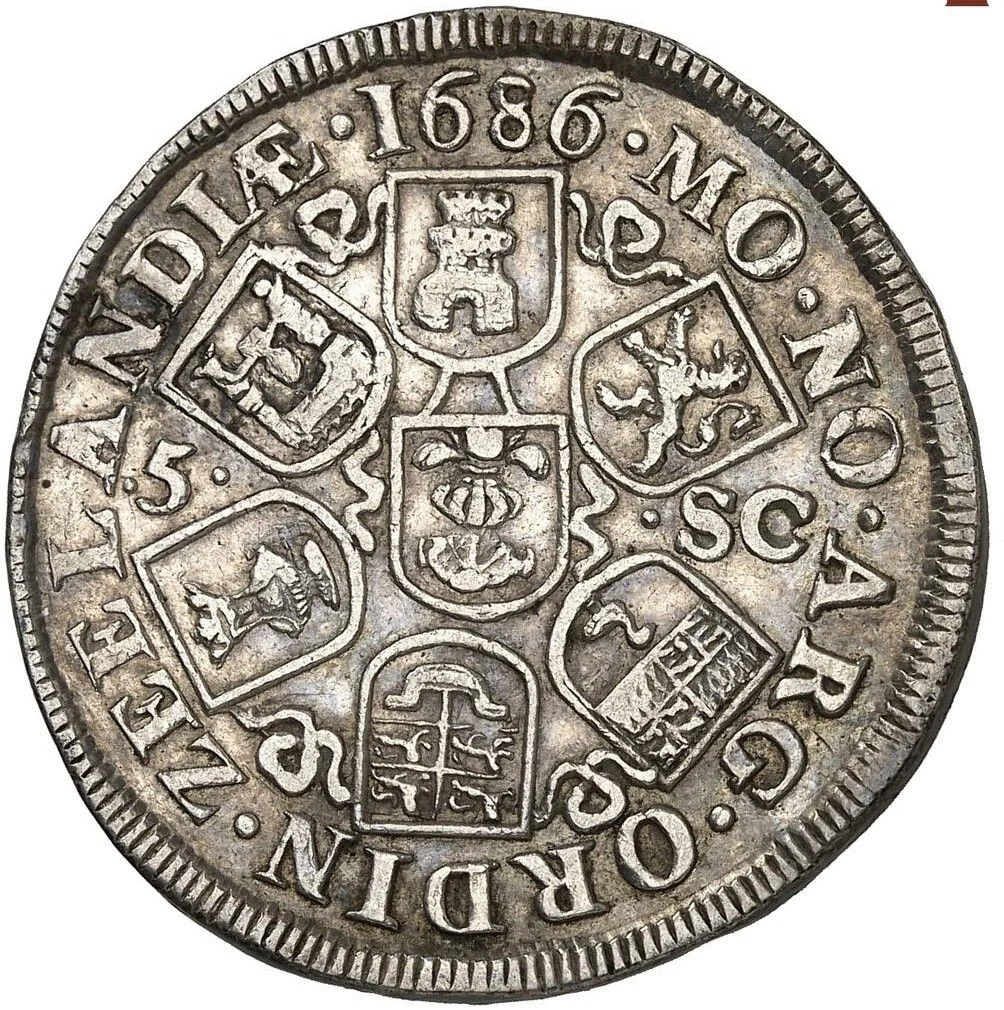 Central shield encircled by six city shields (Middelburg, Zierikzee, Goes, Tholen, Vlissingen, Veere) around Prince William III's arms, flanked by value and ribbons.