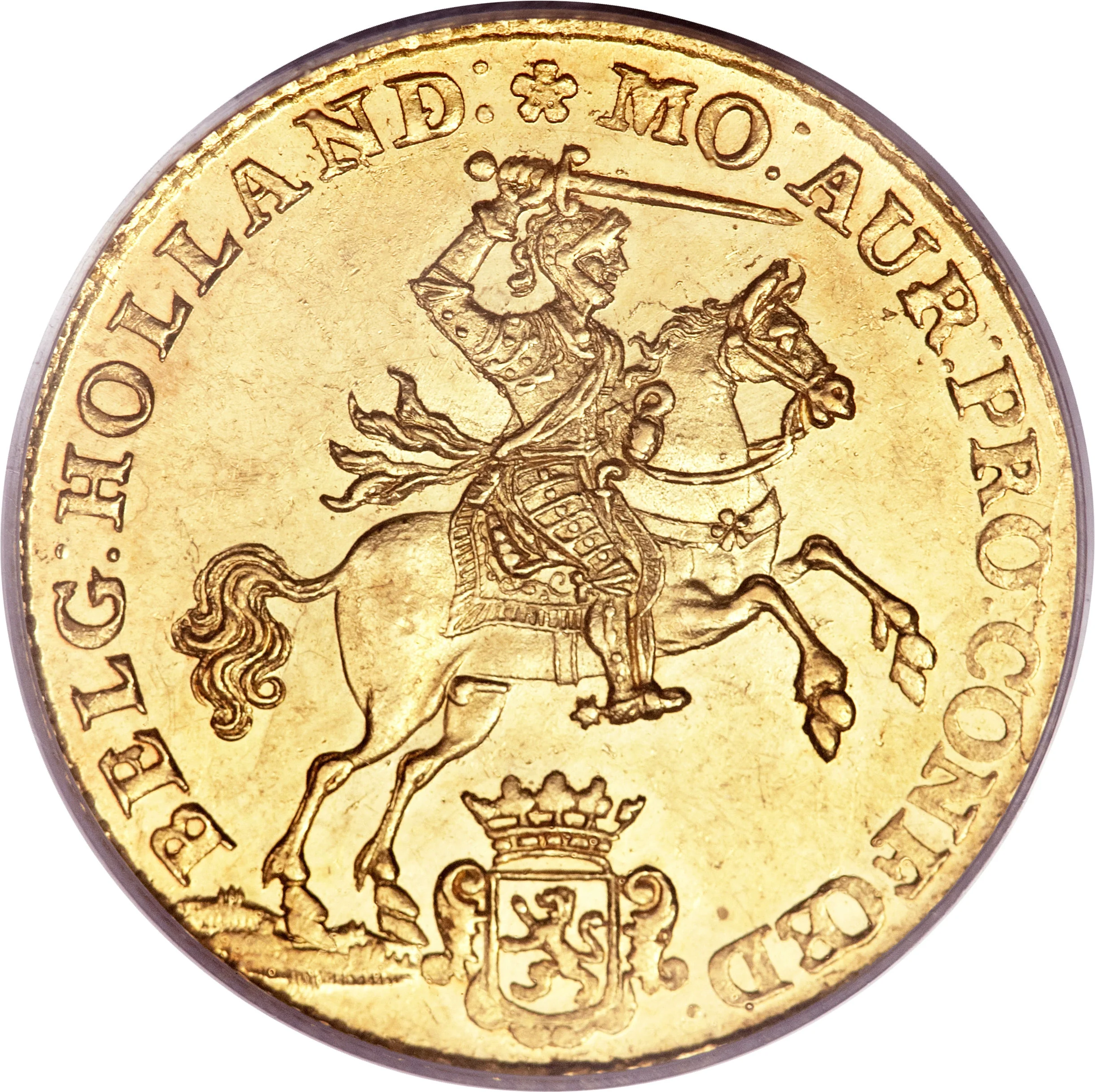 Armored knight on charging horse, holding sword, above crowned arms of Holland.