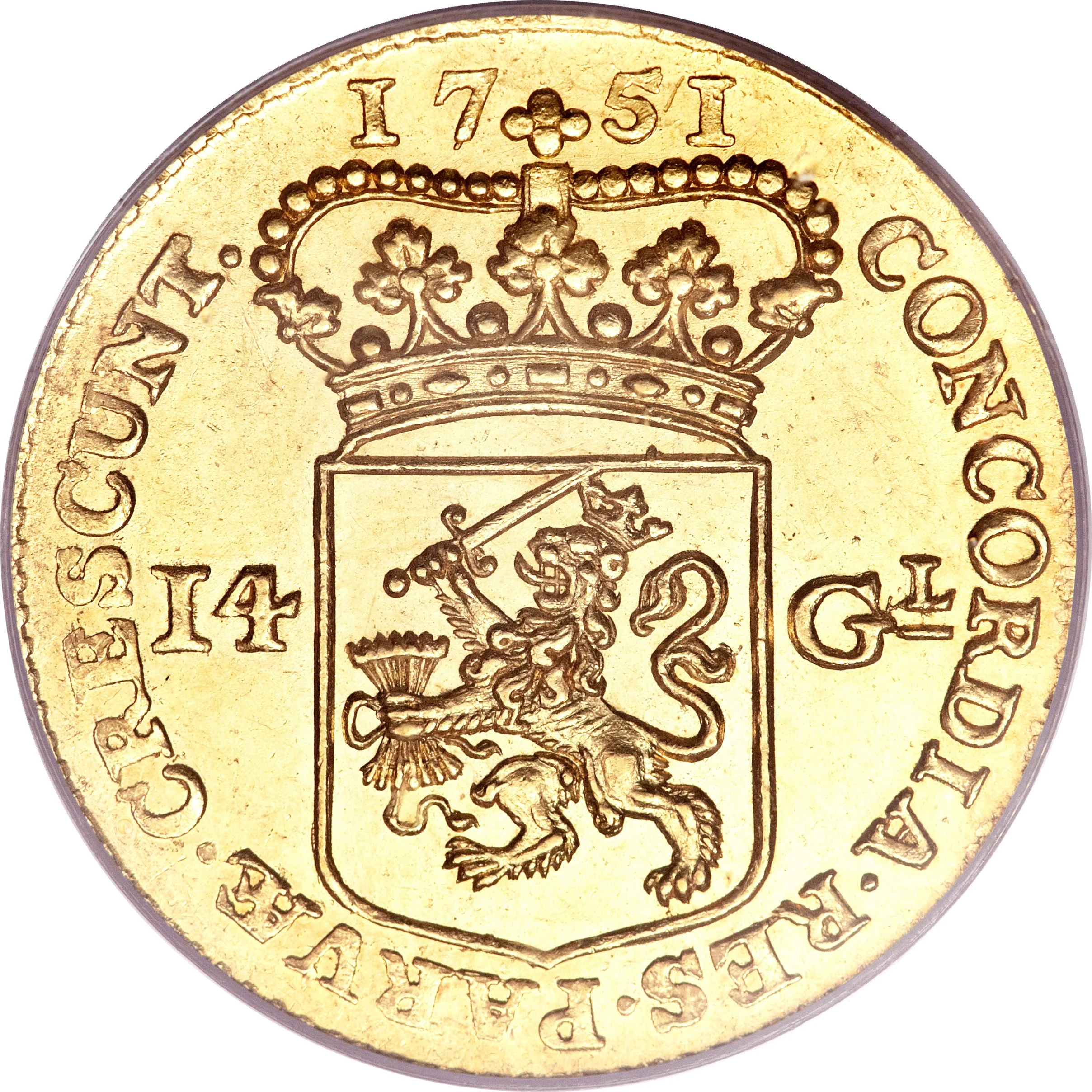 Shield of the United Provinces divides value; date above.