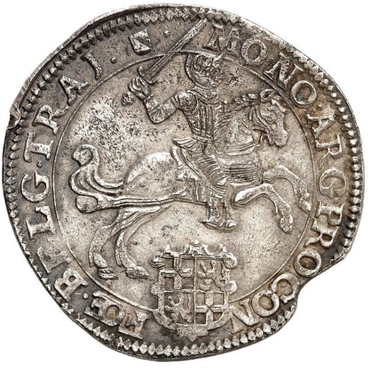Armored knight on charging horse, brandishing sword, above Utrecht arms.