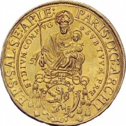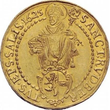 Saint Rupert holding a salt barrel and crozier, above the Salzburg arms.