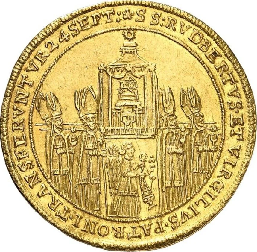 Salzburg Cathedral divides the date between St. Rupert (left) and St. Virgilius (right). The city's arms below split the surrounding legend, which begins at 7 o'clock.