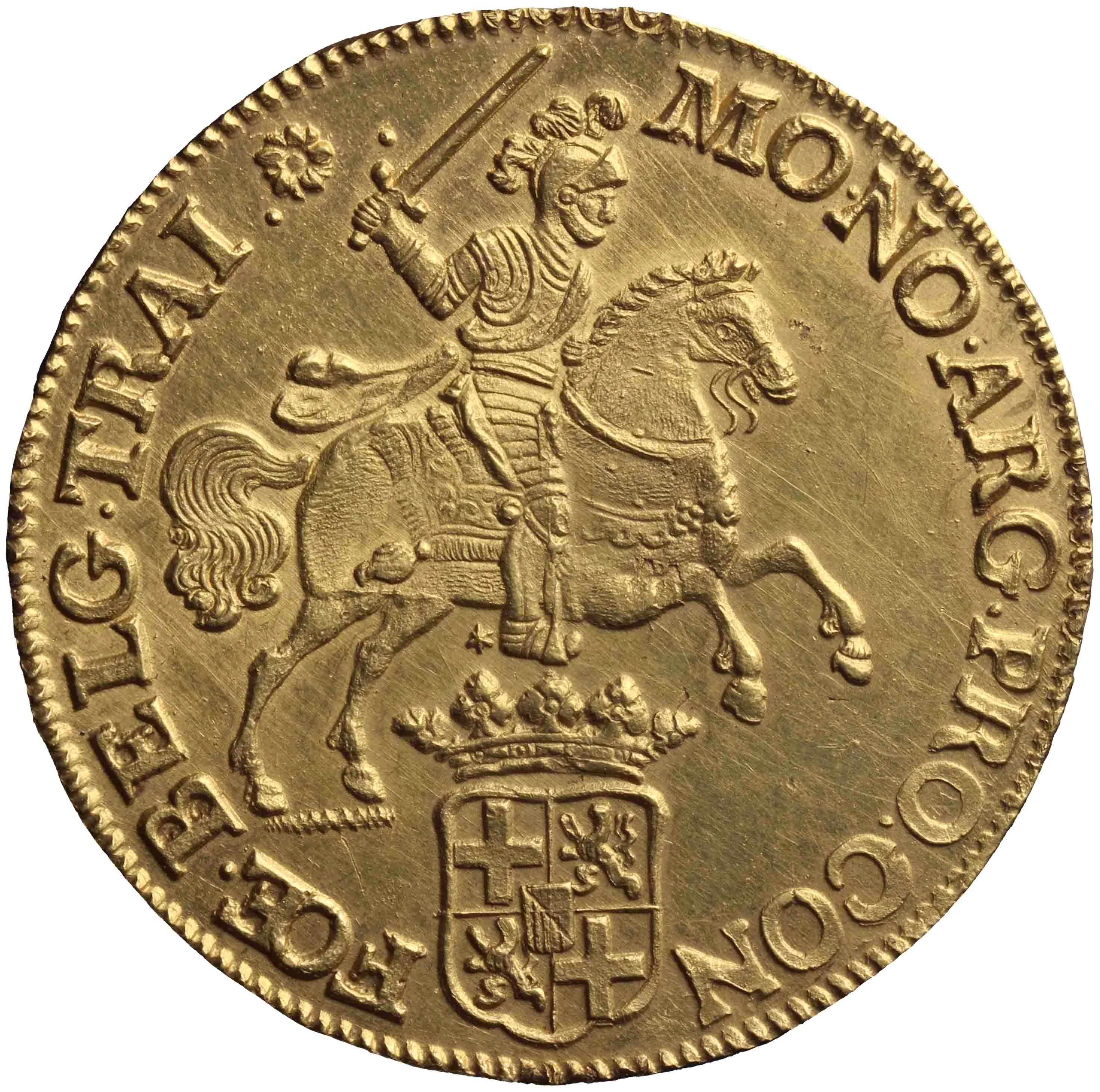 Armored knight on charging horse, brandishing sword, above Utrecht arms.