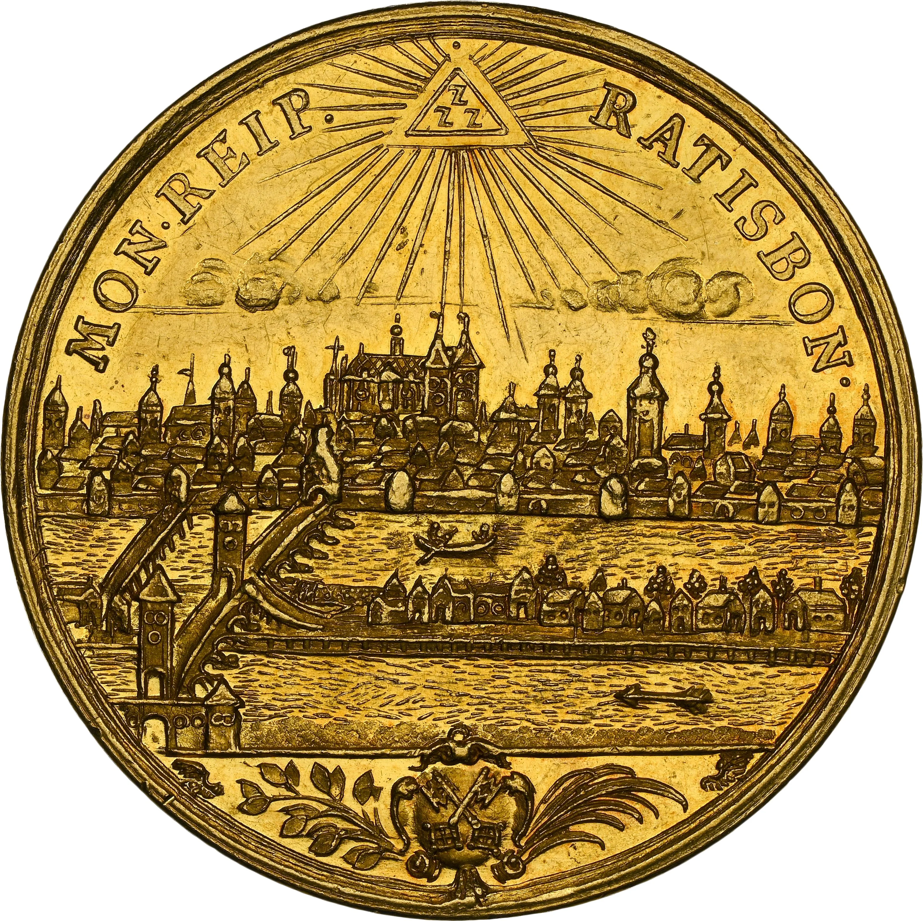 Eye of God above city view, city arms below between laurel and palm.