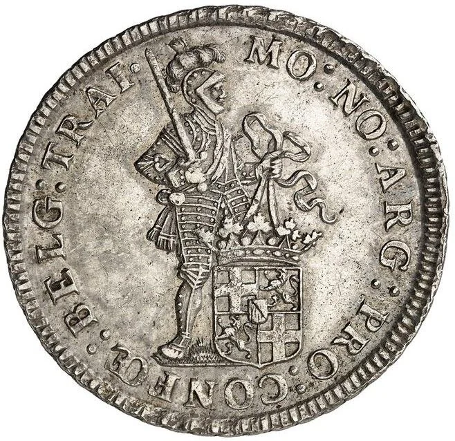 Knight in armor facing right, sword on shoulder, holding a ribbon, with a crowned Utrecht shield at his feet.