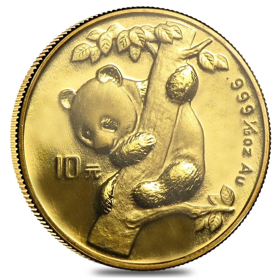 A panda hangs from a tree on the reverse, alongside weight, purity, and denomination inscriptions.