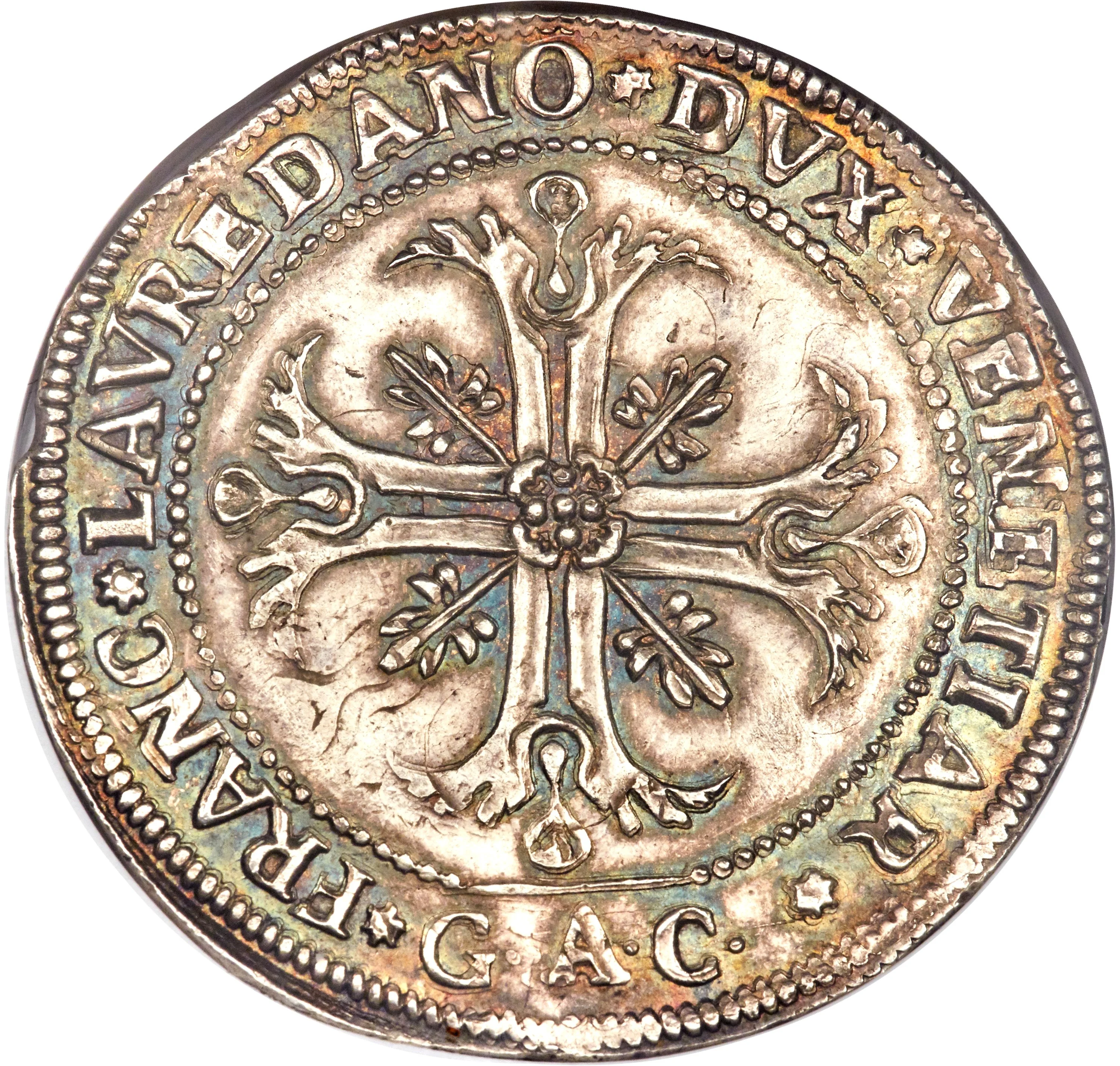 Large foliated cross with central rose, leaf in each angle, all within circle; mintmaster's initials in exergue.