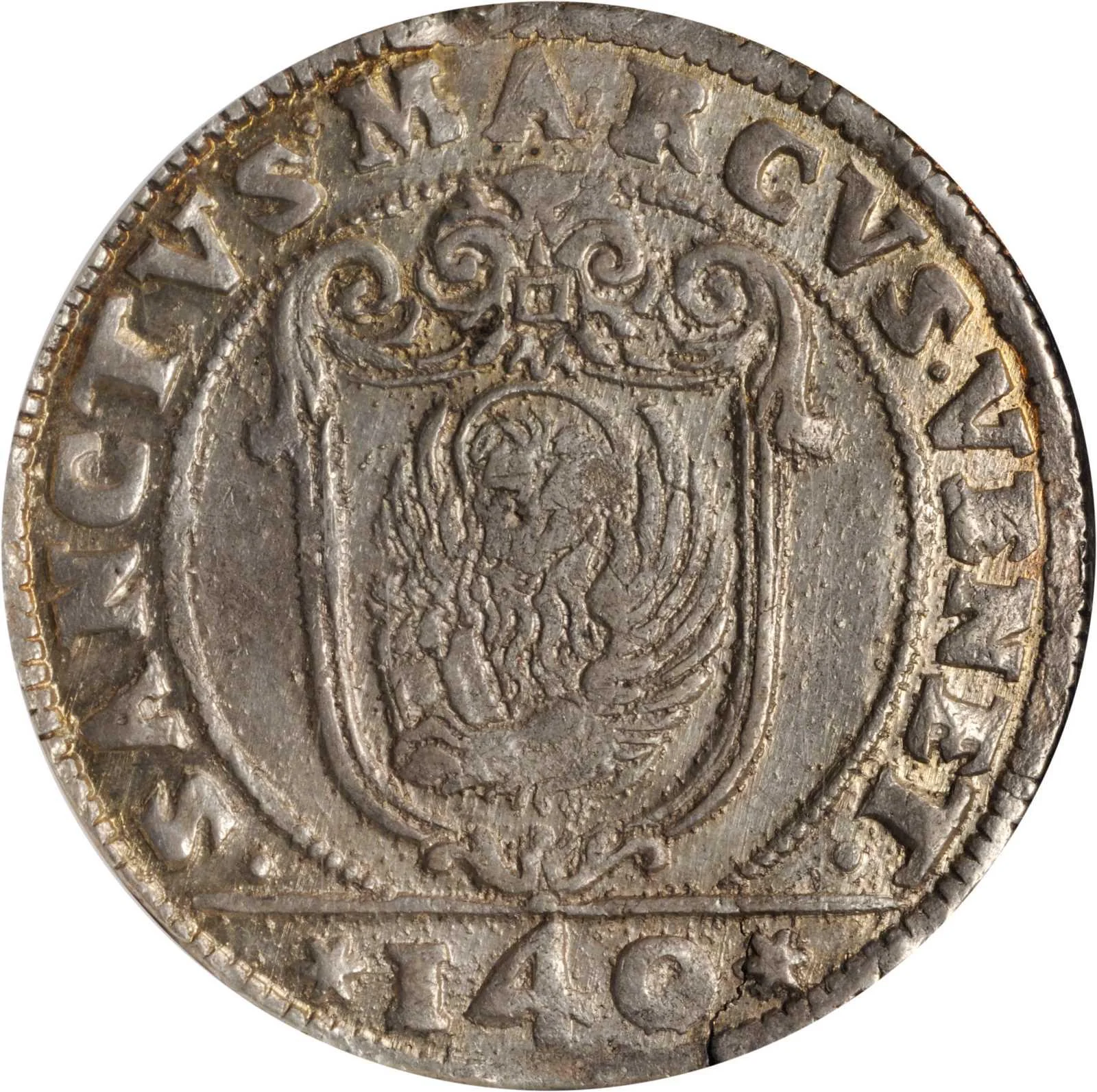 Lion of St. Mark in ornate shield, '140' below.