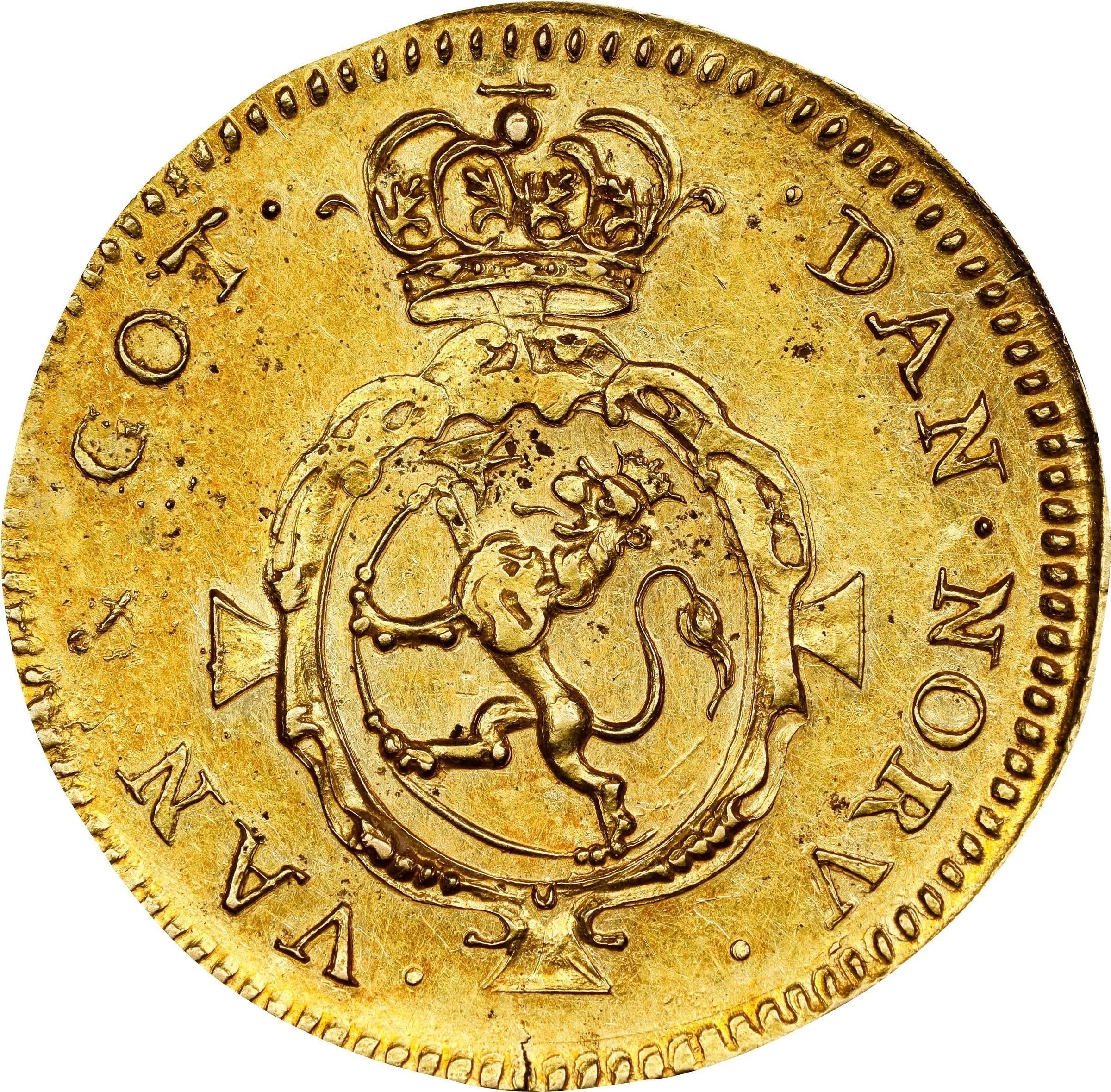 Crowned lion holding an axe, left-facing in an oval shield atop a cross. The crowned shield is encircled by an inscription, with a beaded ring on the rim.