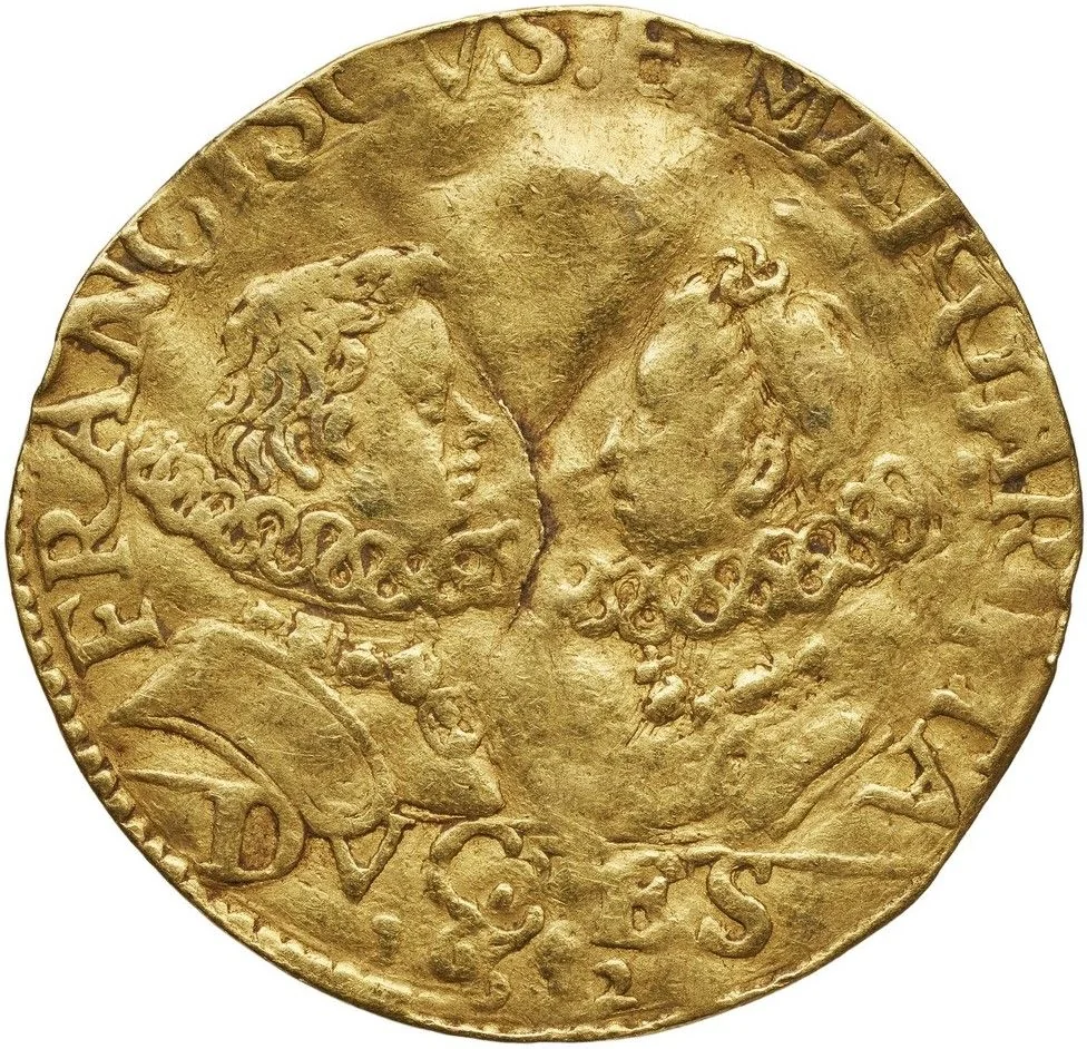 Confronting busts of Francesco and Margherita, dated inscription below.