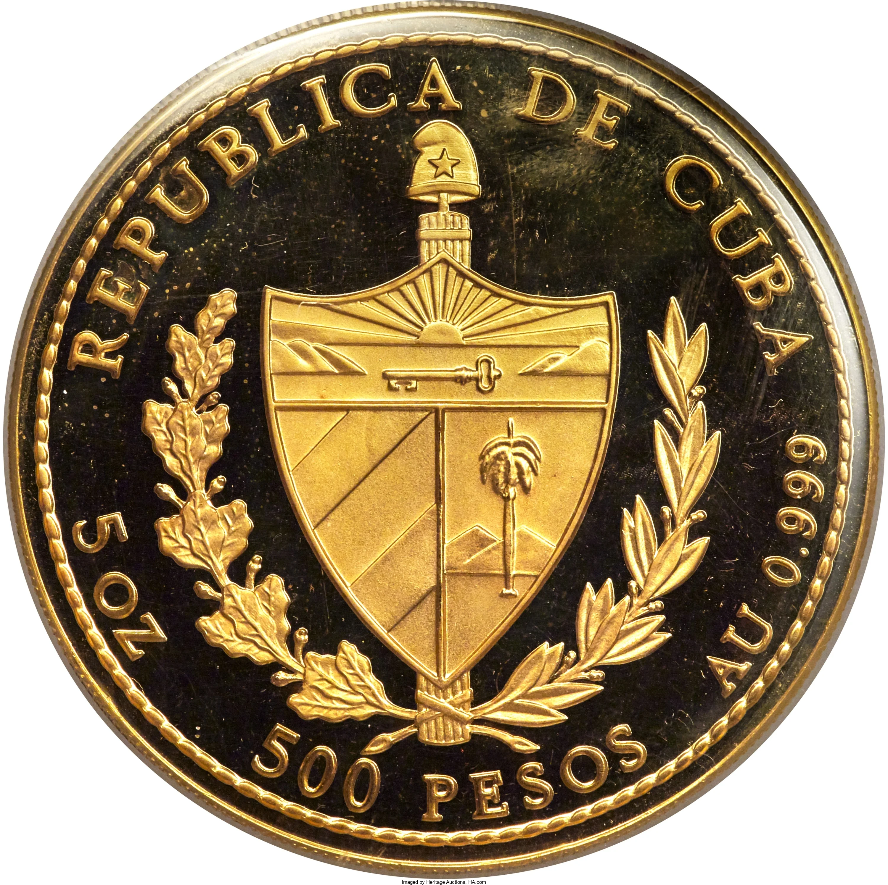 Cuban coat of arms with curved country name above, face value below, weight and fineness on sides, rope edge design.
