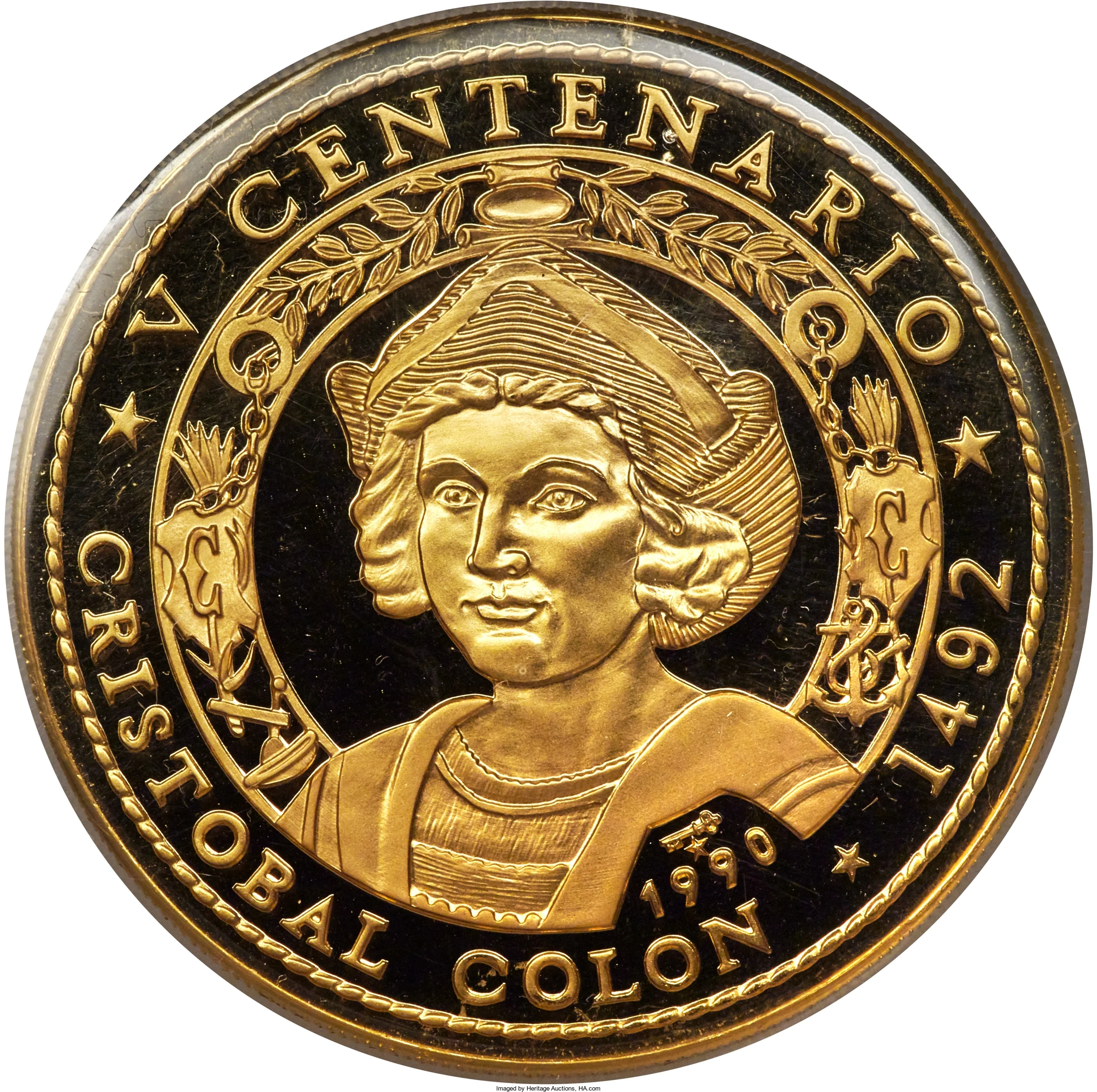 Bust of Columbus with olive wreath and naval items. Name below; event and date above and right. Mintmark and issue date at bottom, encircled by a double rope border.