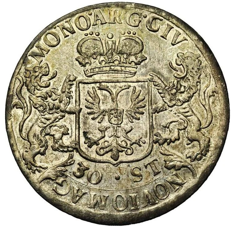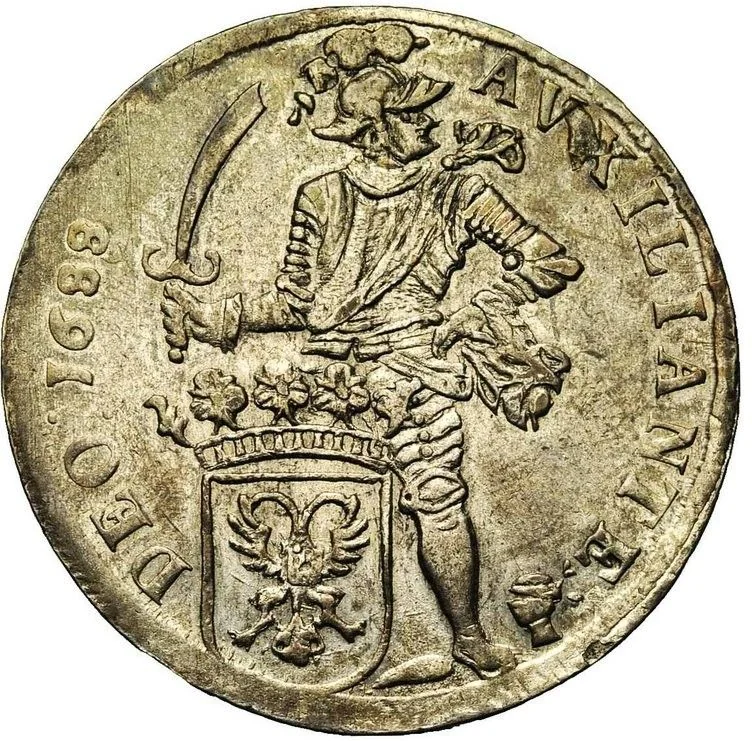 Armored knight facing forward, head turned right, wielding a sword. Crowned Nijmegen arms at his feet. Date in legend.