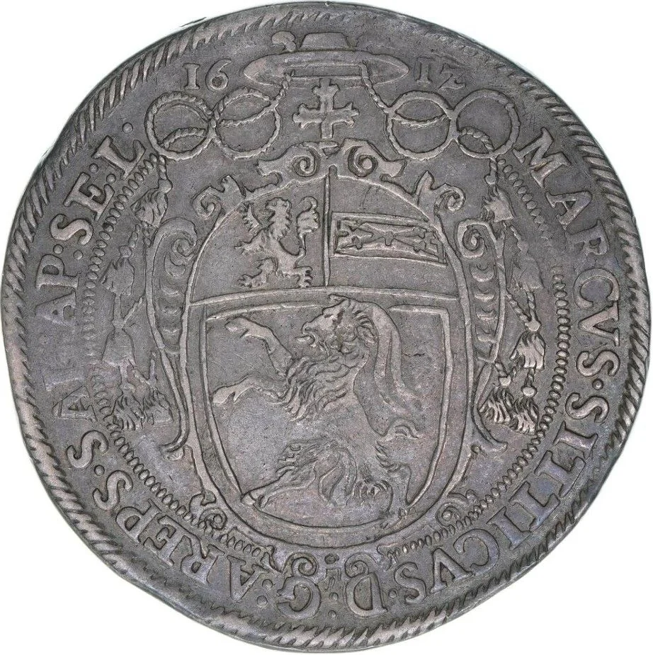 Oval shield under a cross and cardinal’s hat. Top: arms of Salzburg. Bottom: arms of Hohenems. Legend around (starts at 2h). Divided date above.