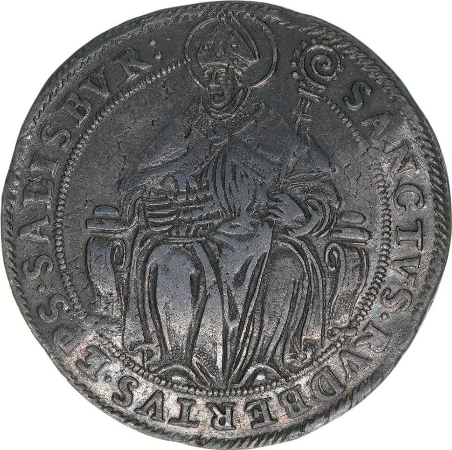 St. Rupert seated left, holding crozier and salt barrel. Circular legend begins at 1 o'clock.