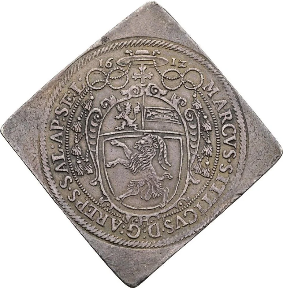 Oval shield under a cross and cardinal’s hat. Top: arms of Salzburg. Bottom: arms of Hohenems. Legend around (starts at 2h). Divided date above.