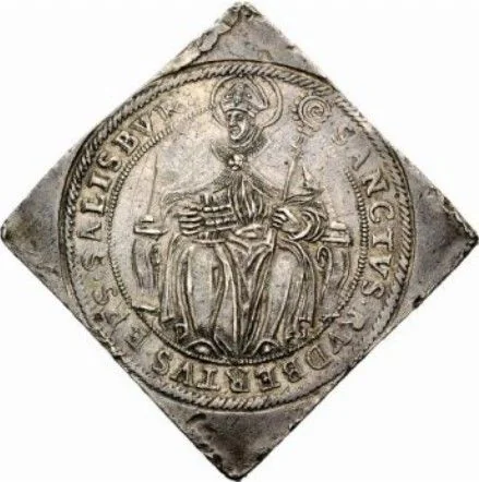 St. Rupert seated left, holding crozier and salt barrel. Circular legend begins at 1 o'clock.