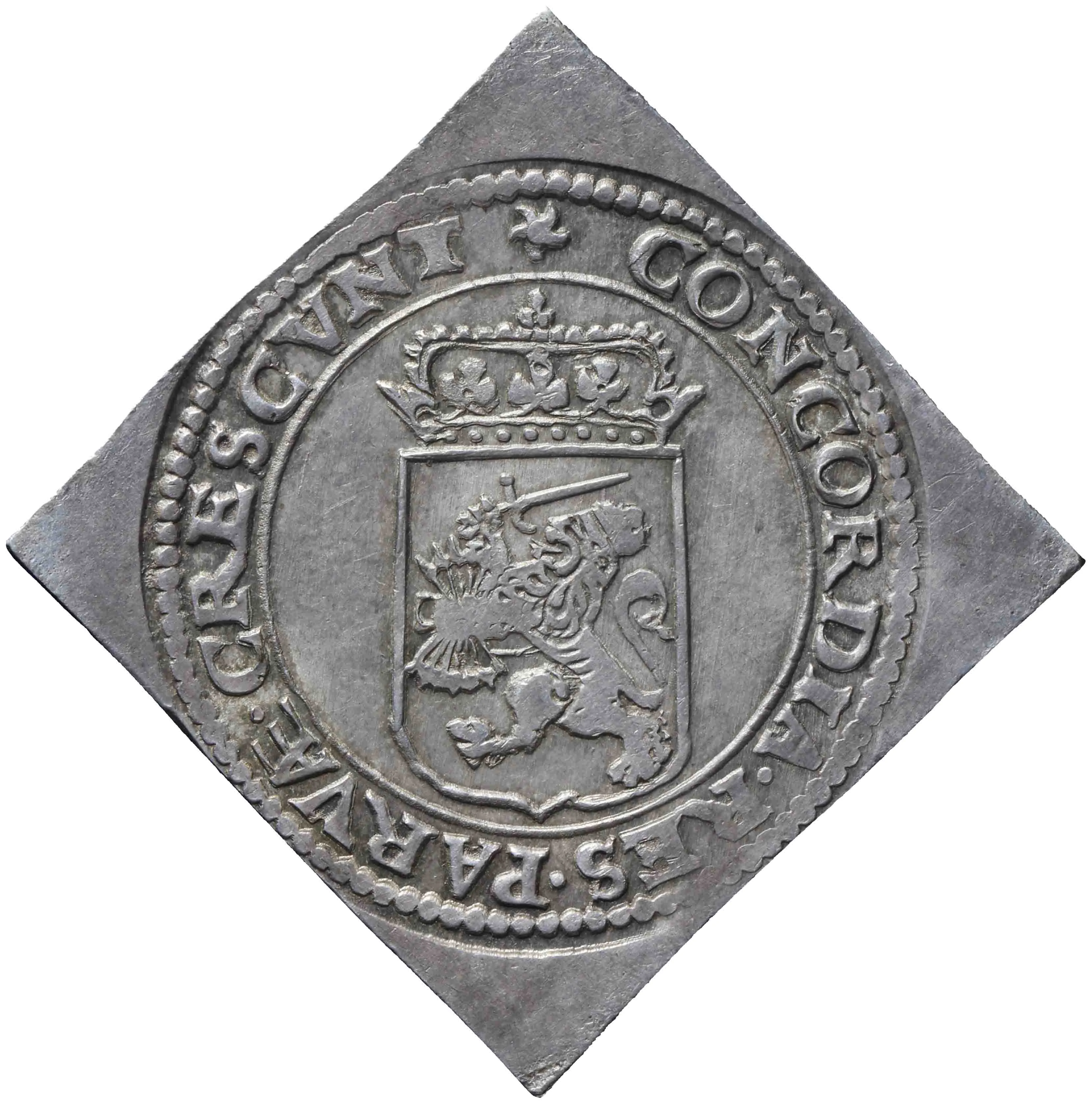 Knight facing right, sword raised, West Friesland shield before him dividing date.
