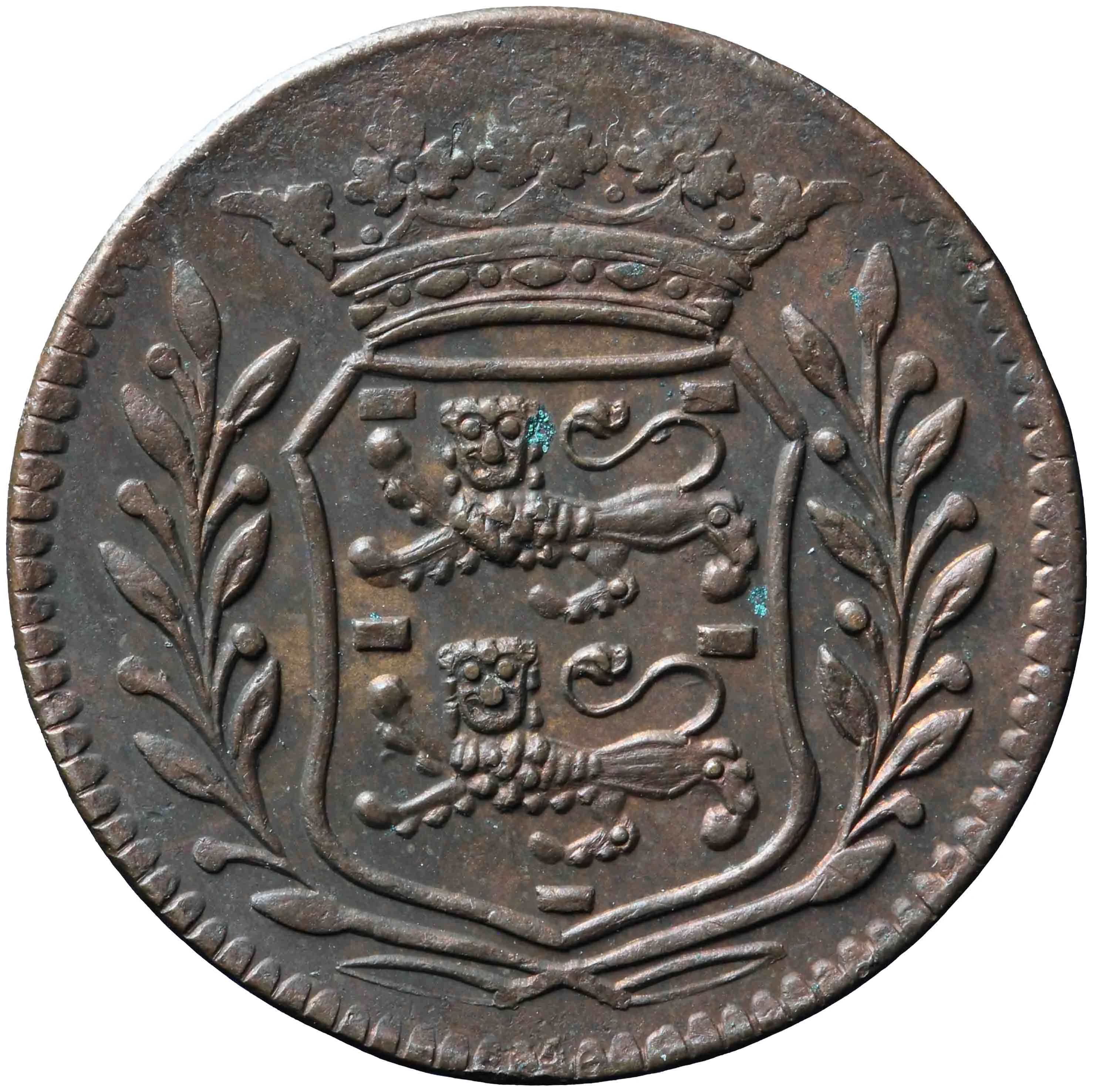 Crowned West Friesland arms within sprigs.