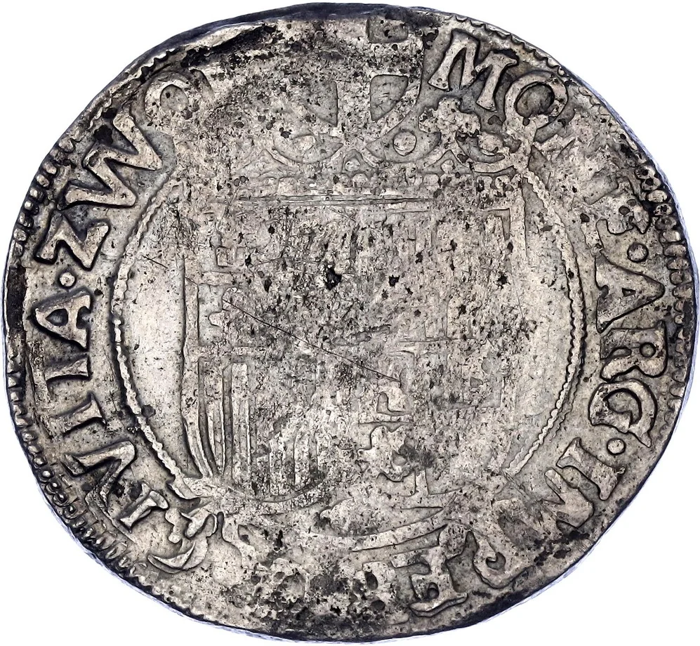 Crowned shield with Spanish arms inside beaded circle. Zwolle mint mark above.