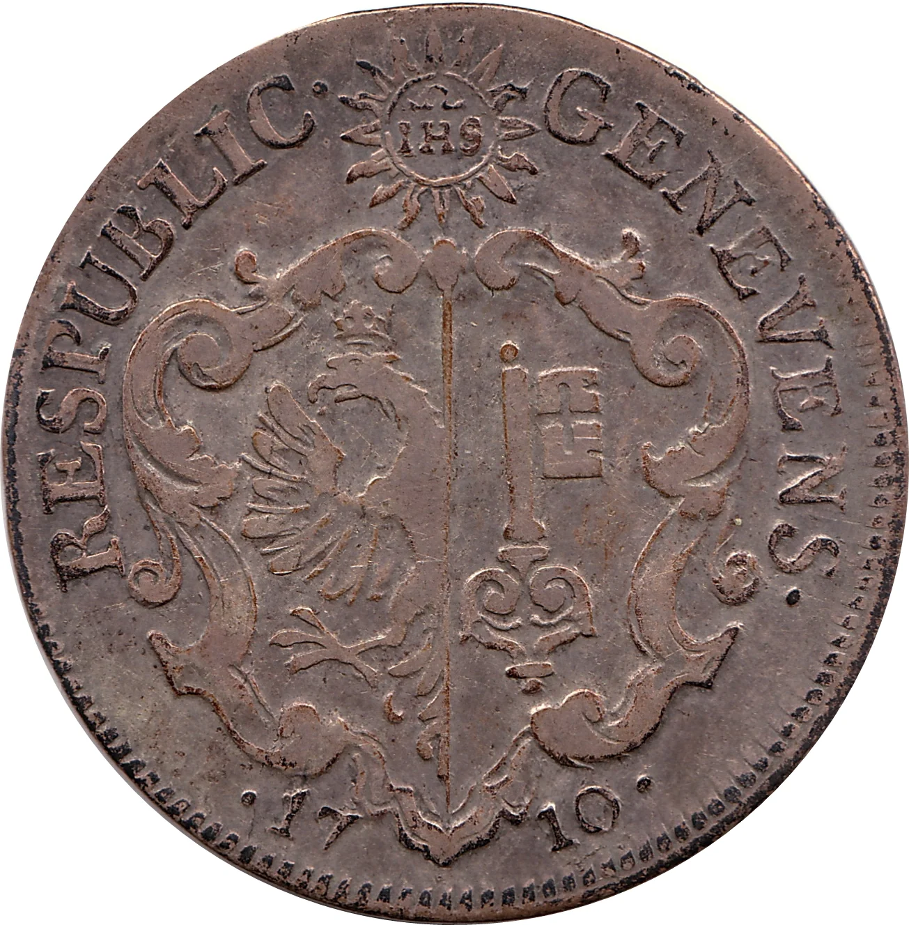 Arms in cartouche, radiant sun with IHS above, date below.