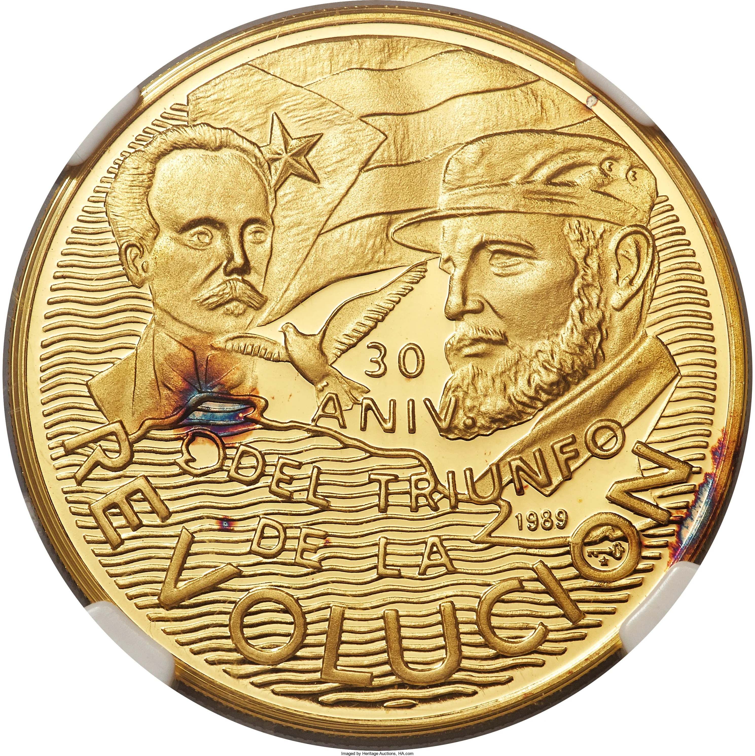 Martí left, Castro right, Cuban flag above with dove between them. Cuba’s southern shore below, wavy lines for the Caribbean. Five-line legend below, year under Castro, mintmark in final "O."