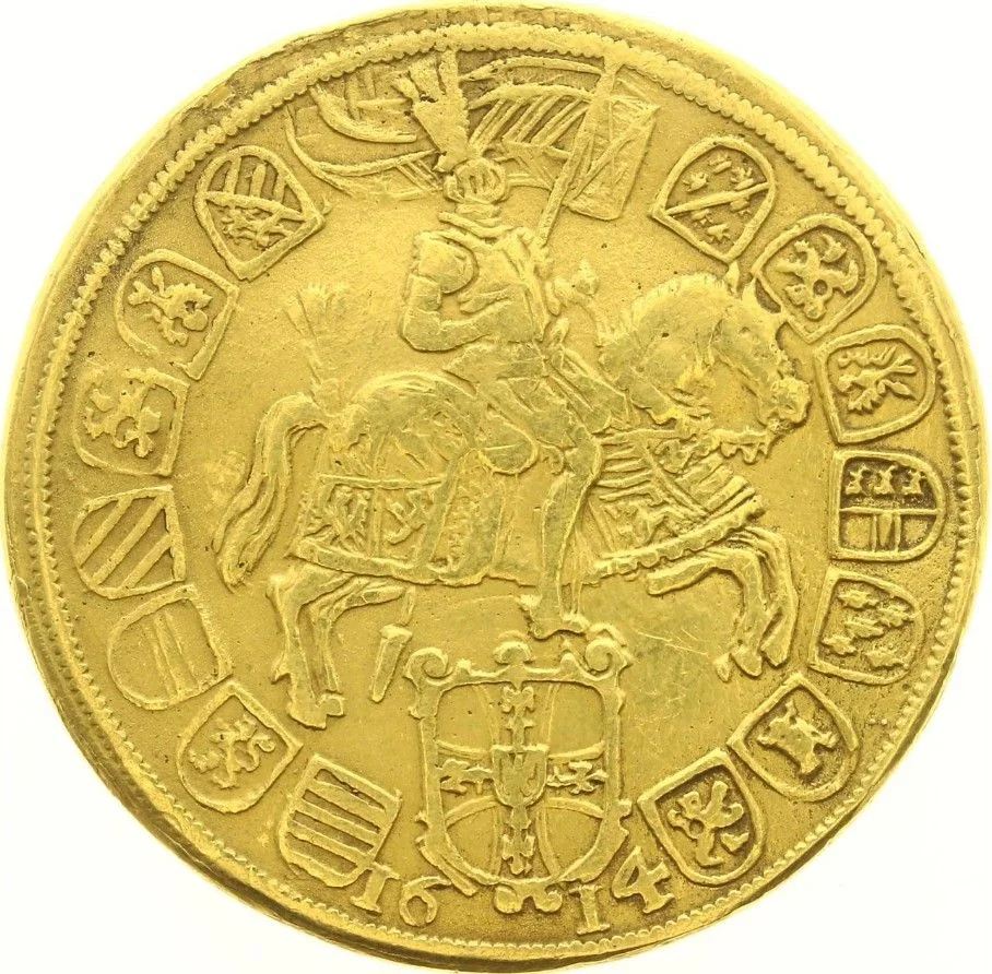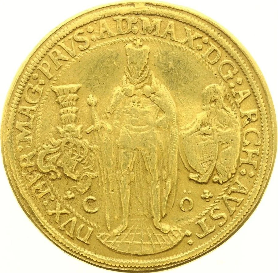 Description: Portrait of Maximilian III in armor, facing slightly left. He wears a mantle and helmet, holds a sword, and displays the Teutonic Order cross. Flanked by a great helm and a lion-held shield of Austria, within a leaved circle. Feet divide the legend and signature "CO."
